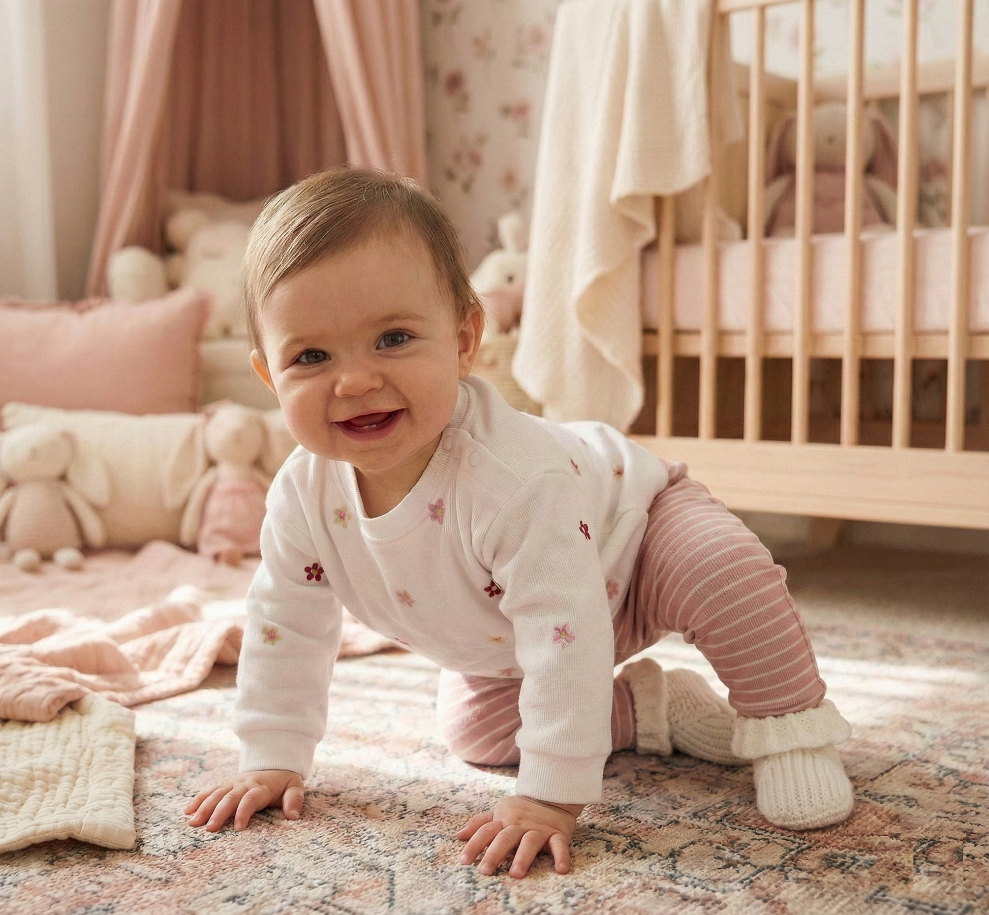 The crisp white pullover sweatshirt features dainty floral embroidery scattered across the front, adding a fresh, garden-inspired touch to her look. Paired with coordinating pink striped leggings, this outfit offers plenty of stretch for crawling, playing, and napping.