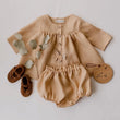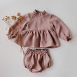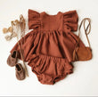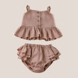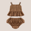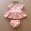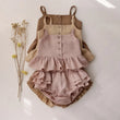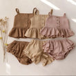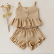 Adorable summer outfit for your little girl! This 2-piece set features a sling top with a ruffled neckline and matching ruffled shorts. Made from soft, breathable fabric, it's perfect for keeping your baby cool and comfortable on warm days. Available in a variety of solid colors for easy mixing and matching. Sizes range from 0-2 years old.