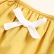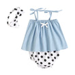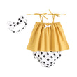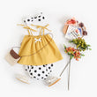 This yellow romper with a polka-dot pattern. It is a two-piece outfit from Sanlutoz and is marketed as summer casual wear for newborn babies.