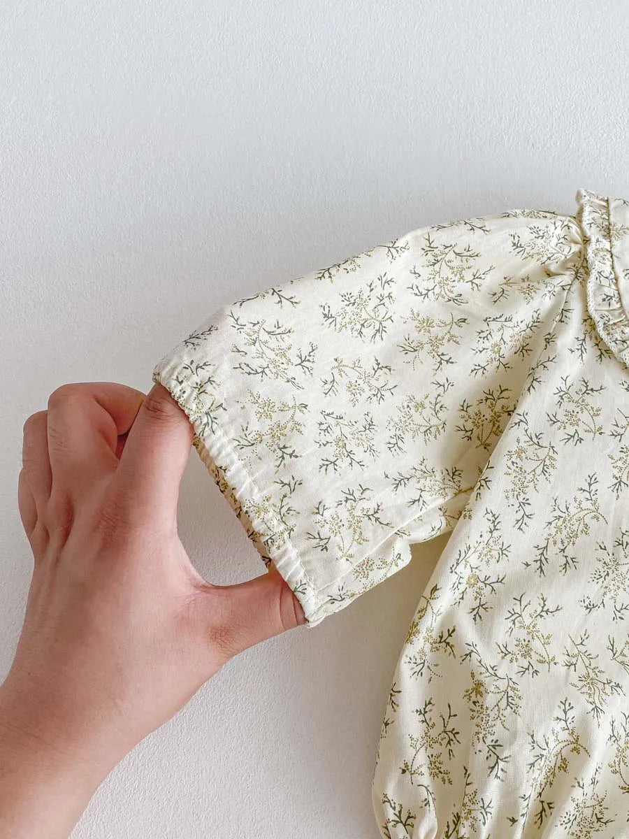 Elevate your little one’s wardrobe with our Korean-style floral baby bodysuit, a perfect blend of vintage charm and modern comfort. Crafted for the transitional breezes of spring and autumn, this one-piece romper features a delicate, earth-toned floral print and a classic Peter Pan collar with dainty ruffle detailing.