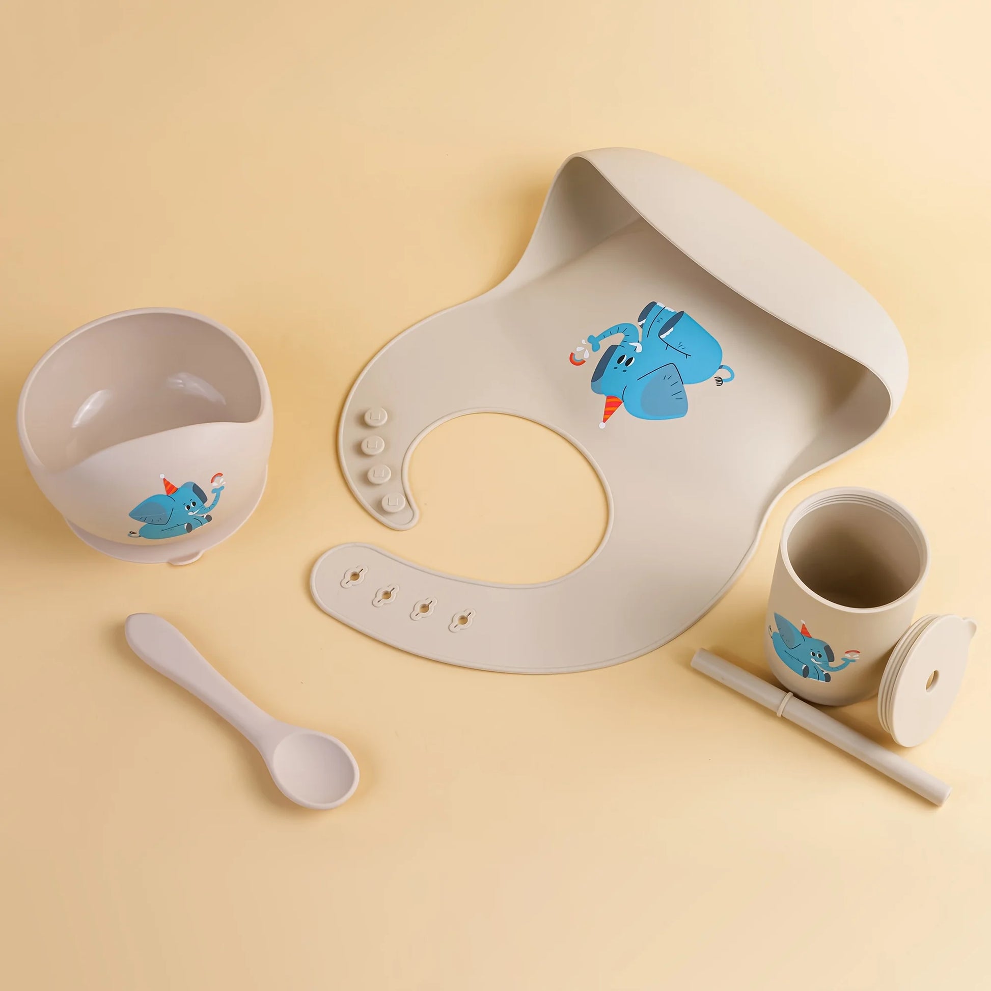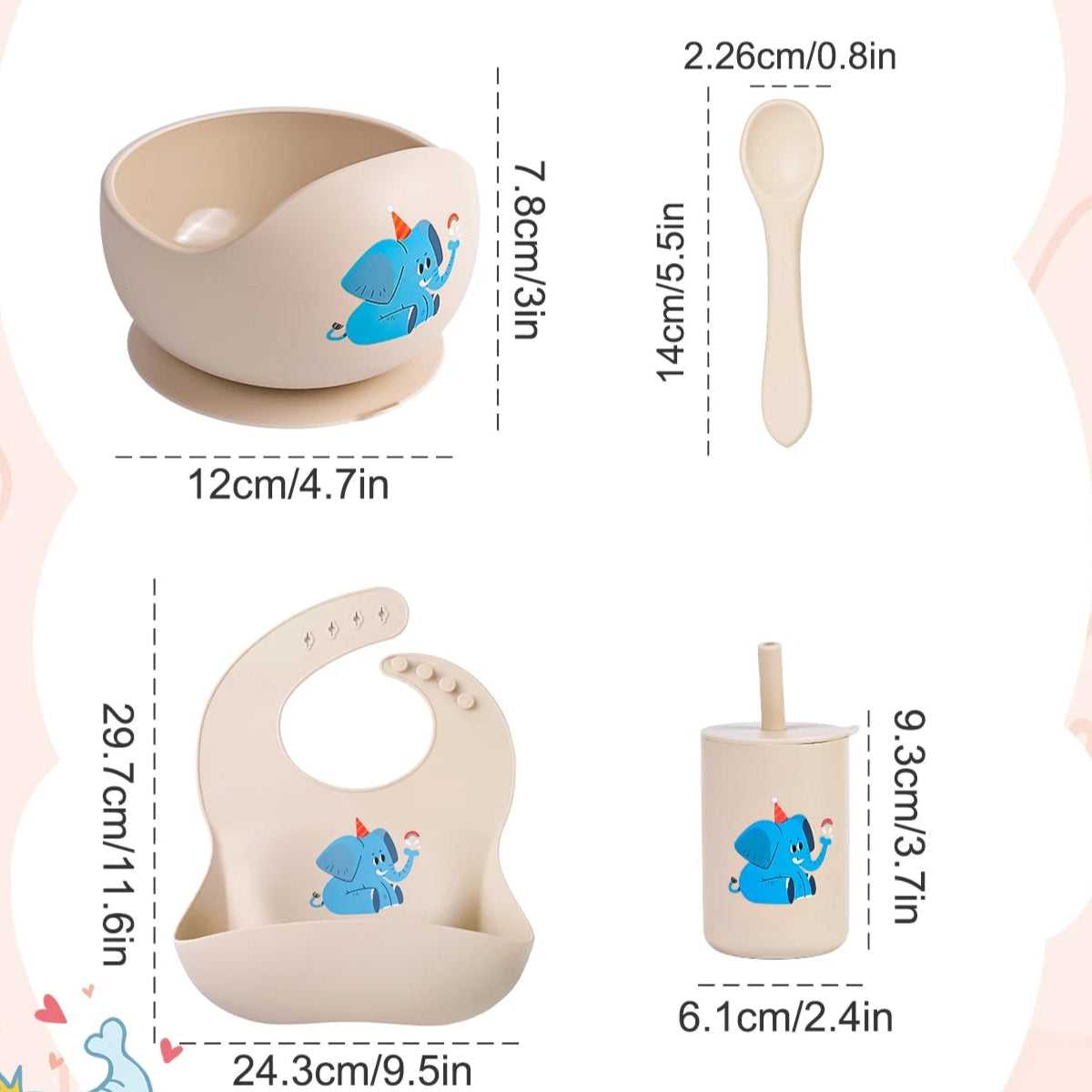 Baby Feeding Set - This 4pcs silicone meal set includes a bowl, bib, fork, and spoon perfect for toddler training and safe feeding time. Made from soft, durable, and easy-to-clean silicone, it’s a practical and thoughtful gift for kids.