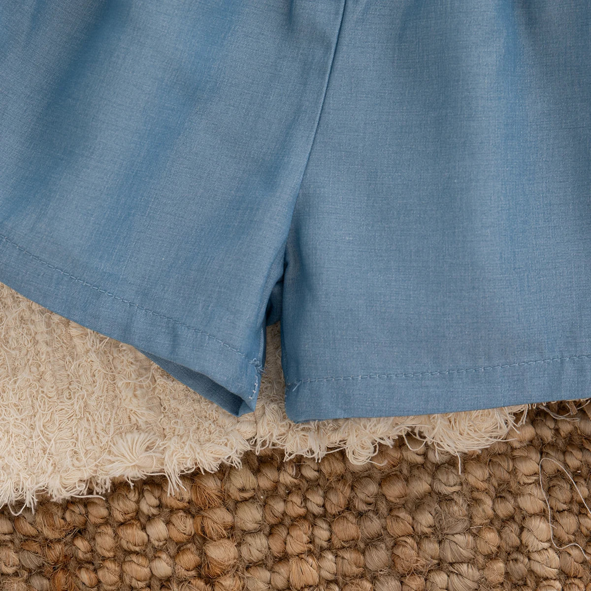 Bring a touch of woodland magic to her summer wardrobe! This charming two-piece set features a lightweight, denim-look cotton blend, perfect for sunny days at the park or family outings. The breezy camisole top is adorned with hand-applied 3D mushroom patches and finished with a sweet ruffle hem, paired with matching comfort-fit shorts.