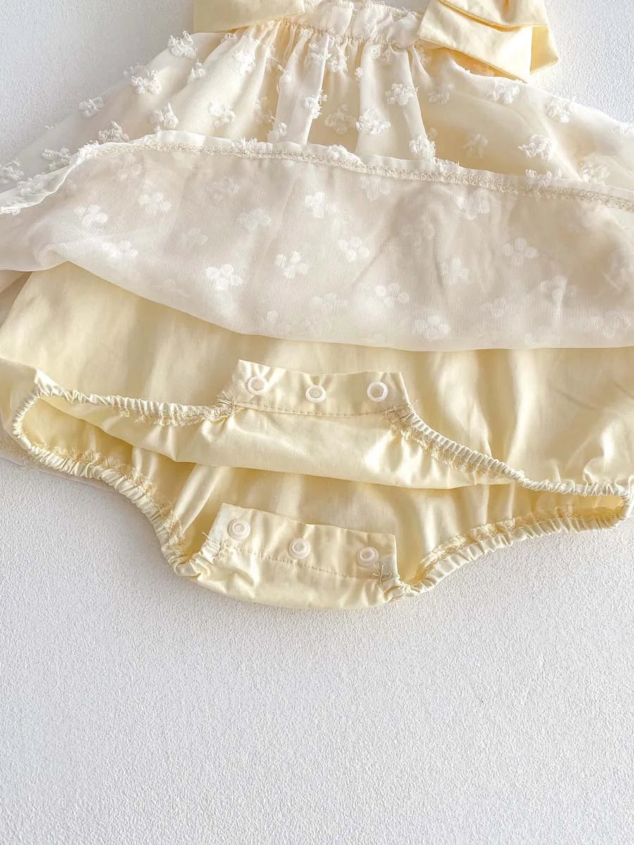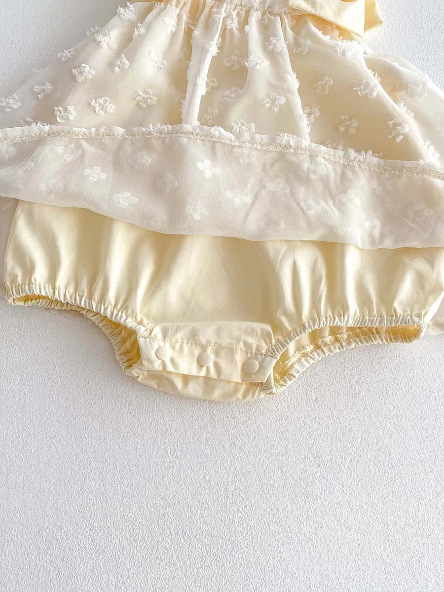 The ultimate summer "mini-moment." Crafted with delicate 3D floral textures and a breezy silhouette, this Korean-inspired romper dress is designed for sunny strolls, family photos, and first birthdays.