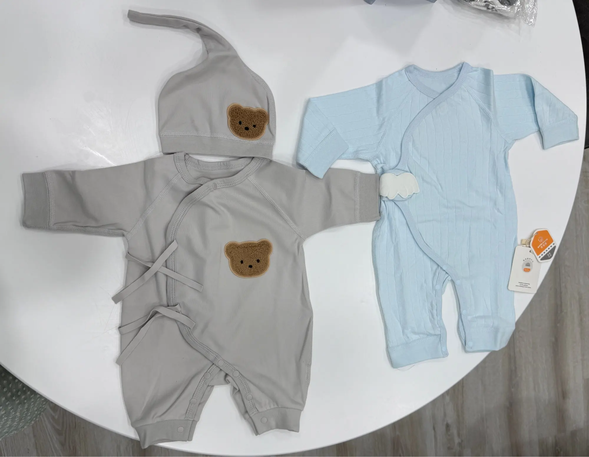 This is the ultimate hospital bag essential. The wrap-style (kimono) design means no pulling fabric over your baby's fragile head—a huge relief for first-time parents. Simply lay the romper flat, place your baby on top, and snap it closed. It is gentle on healing belly buttons and perfect for quick changes.